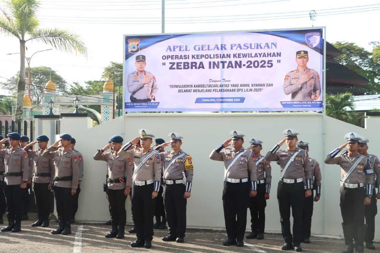 Polres Tabalong melaksanakan apel gelar pasukan Operasi Zebra Intan 2025 di halaman Mapolres Tabalong pada 17 November 2025. Apel dipimpin Kapolres Tabalong serta dihadiri beragam unsur terkait untuk mendukung peningkatan Keselamatan dan Ketertiban Lalu Lintas di wilayah Tabalong.