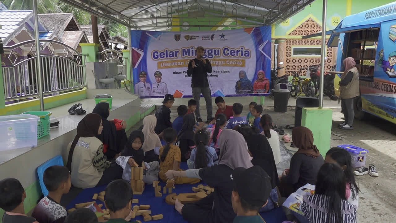 Kegiatan peningkatan literasi anak kembali digelar Dinas Perpustakaan dan Kearsipan Kabupaten Tabalong melalui program Gelar Minggu Ceria atau Gerakan Literasi Minggu Ceria pada 15 Februari 2026. Kegiatan ini dilaksanakan di Ruang Terbuka Hijau Desa Solan, Kecamatan Jaro, yang diikuti puluhan anak sekolah dasar di Desa Solan.