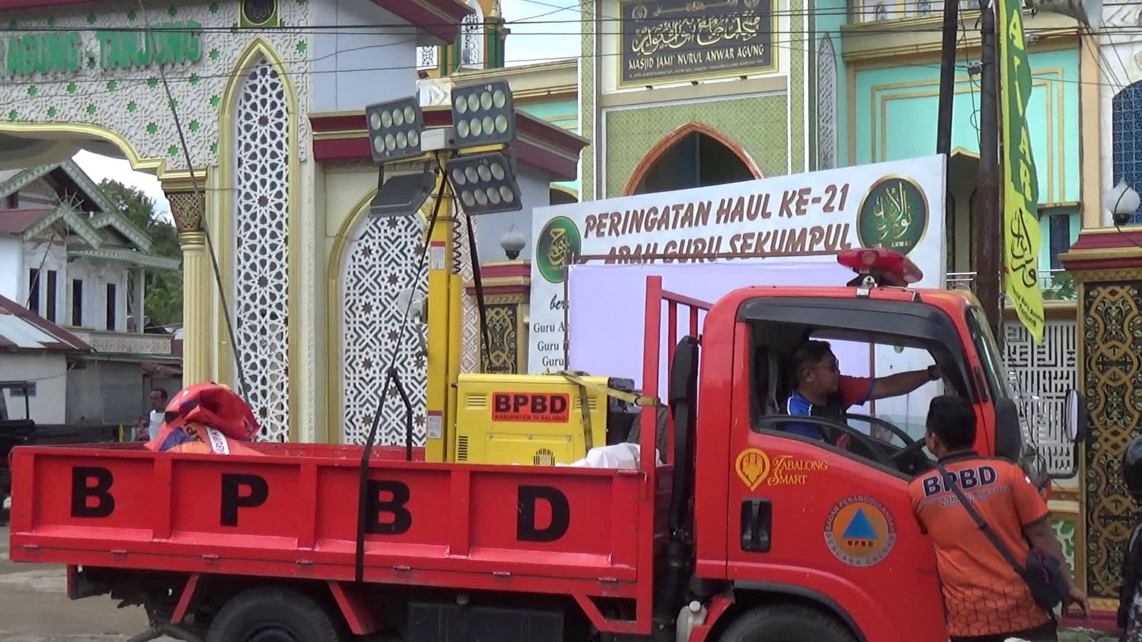 Badan Penanggulangan Bencana Daerah (BPBD) Kabupaten Tabalong memberikan dukungan pada pelaksanaan Haul Kiai Haji Muhammad Zaini bin Abdul Ghani atau Abah Guru Sekumpul yang digelar di Masjid Nurul Anwar, Kelurahan Agung, pada Jumat malam, 2 Januari 2026. Dukungan yang diberikan berupa penyediaan penerangan hingga pengadaan tenda posko.
